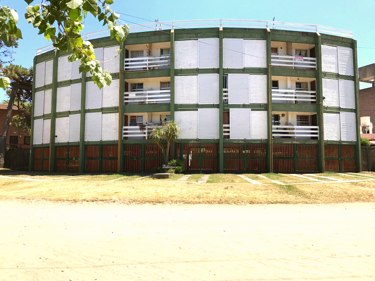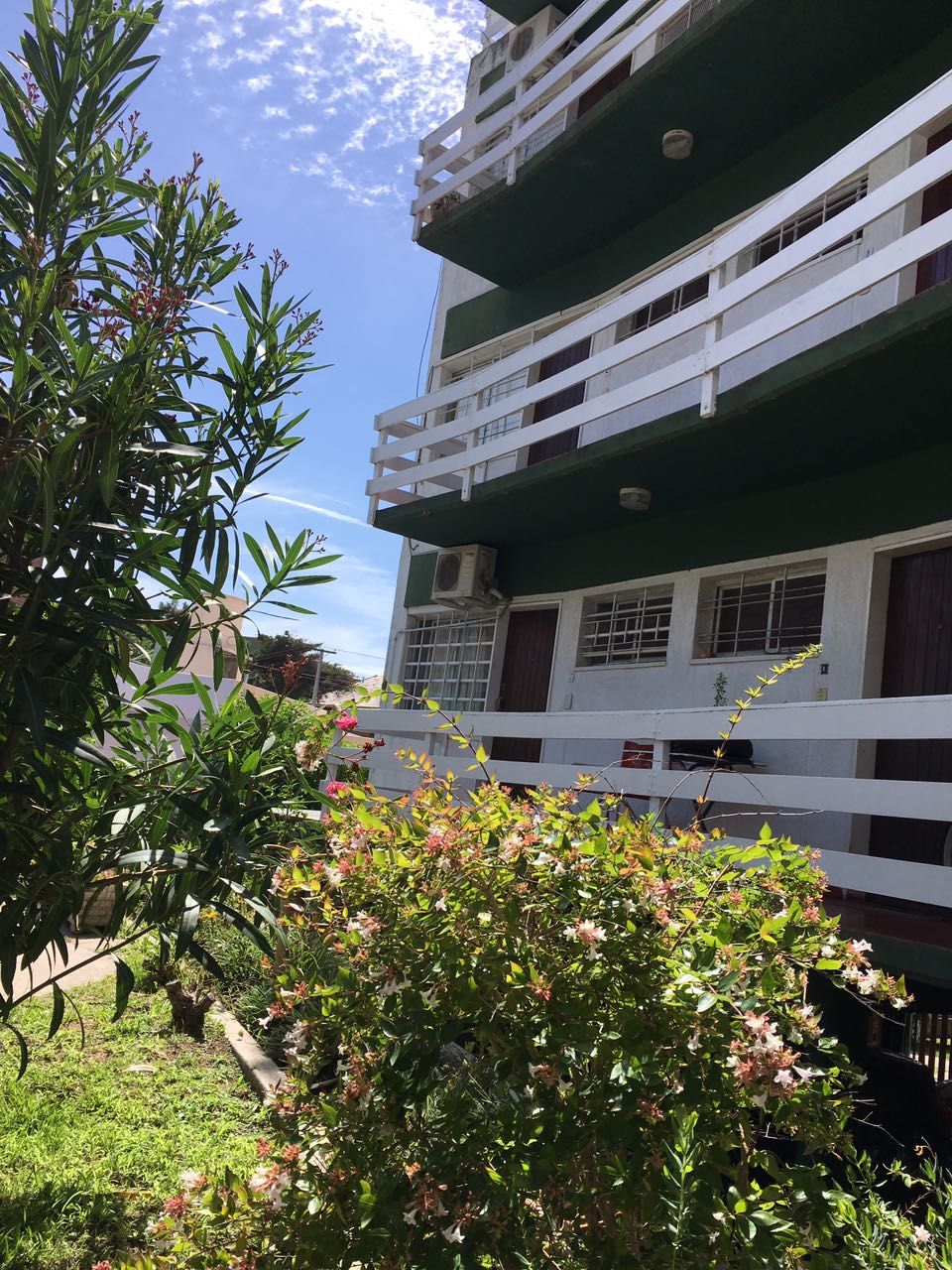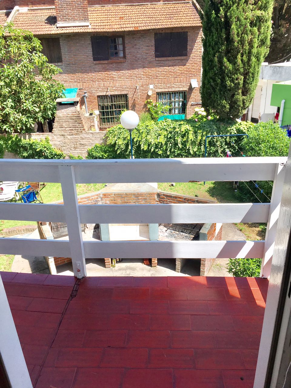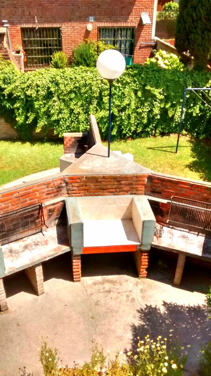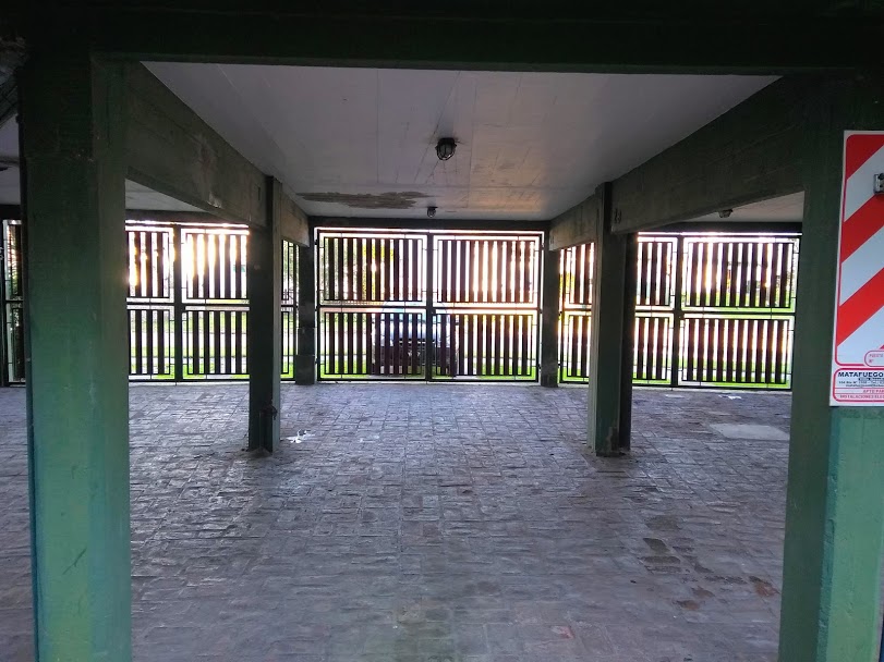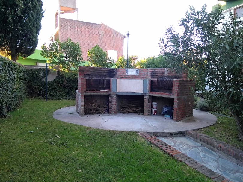 Cuenta con cochera cubierta y parrillas en la parte trasera del edificio.