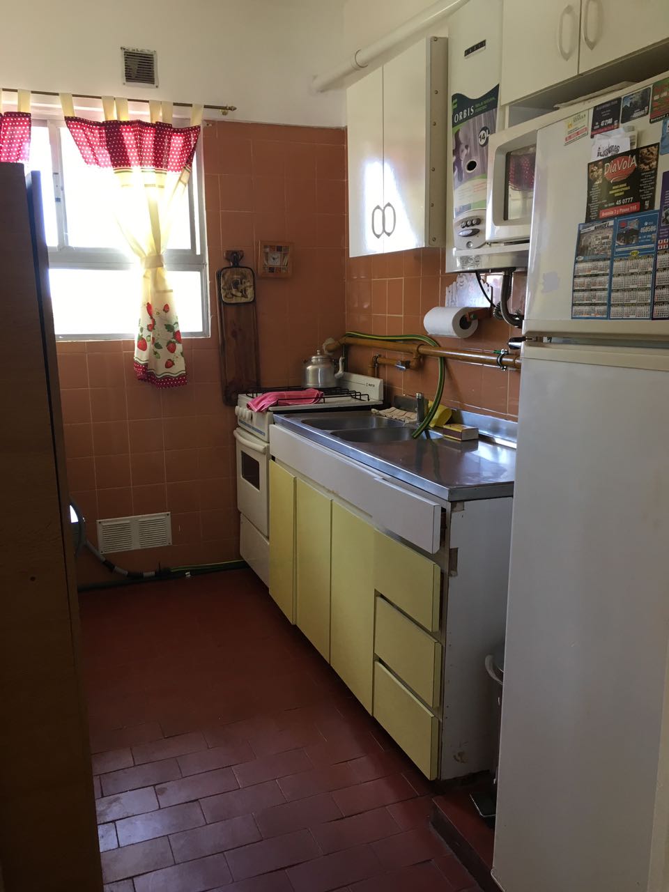 La cocina es muy cómoda tiene 3 hornallas y horno convencional, horno microondas, heladera con refrigerador, calefón de tiro forzado y Gas Natural.
